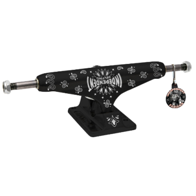 Independent Trucks Fabiana Defino Pro Stage 11 Hollow featuring black fine-texture powder coated finish with laser engraved all-over bandana theme on hanger and baseplate, white cushions, silver hardware, and custom punk pin style keychain hangtag.